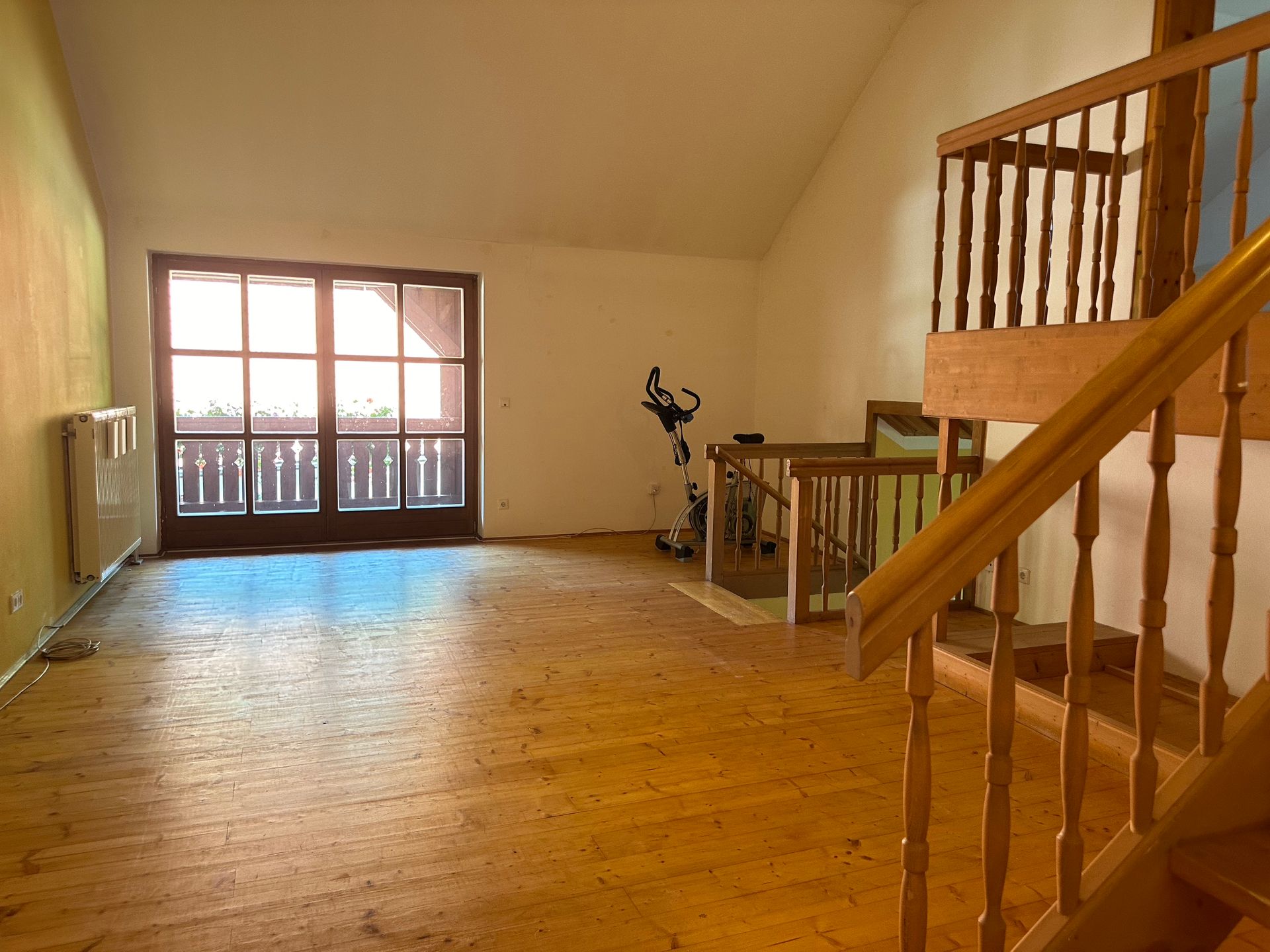 Die Wohnung hat ca. 120 m2 und ist auf 3 Ebenen aufgeteilt. Durch den Kachelofen, den Holzherd, das viele Holz ist diese Wohnung unglaublich gemütlich. Natürlich ist eine EBK auch vorhanden. Vom Esstisch aus sieht man durch eine doppelflügelige Türe direkt auf den Balkon und den 15 m Schwimmteich, den kleinen Reitplatz und ins kleine Tal und die Hofauffahrt.