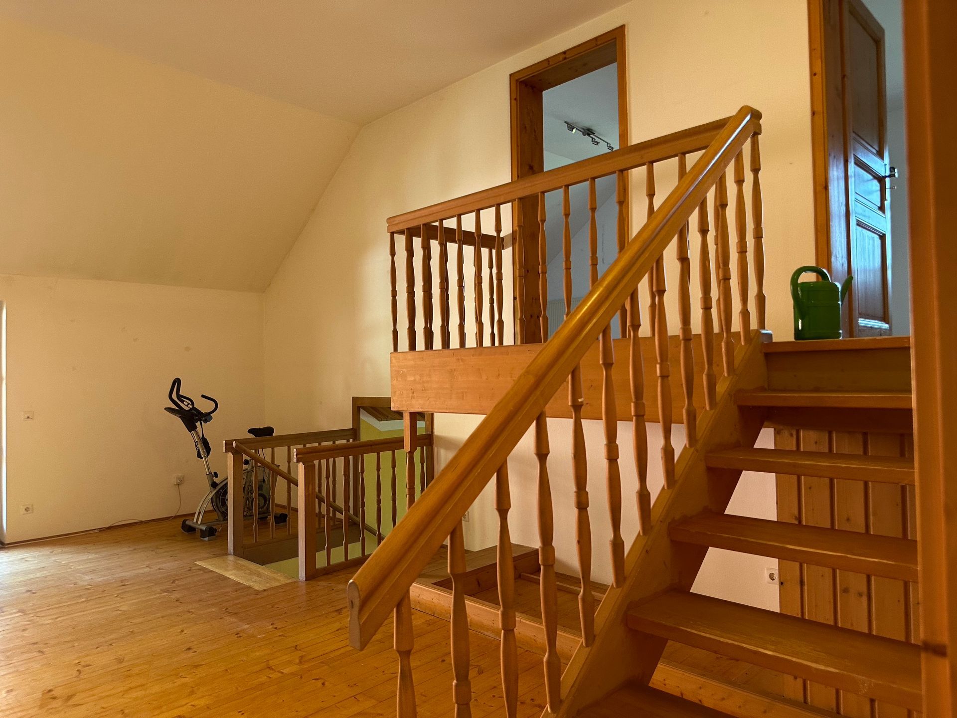 Die Wohnung hat ca. 120 m2 und ist auf 3 Ebenen aufgeteilt. Durch den Kachelofen, den Holzherd, das viele Holz ist diese Wohnung unglaublich gemütlich. Natürlich ist eine EBK auch vorhanden. Vom Esstisch aus sieht man durch eine doppelflügelige Türe direkt auf den Balkon und den 15 m Schwimmteich, den kleinen Reitplatz und ins kleine Tal und die Hofauffahrt.